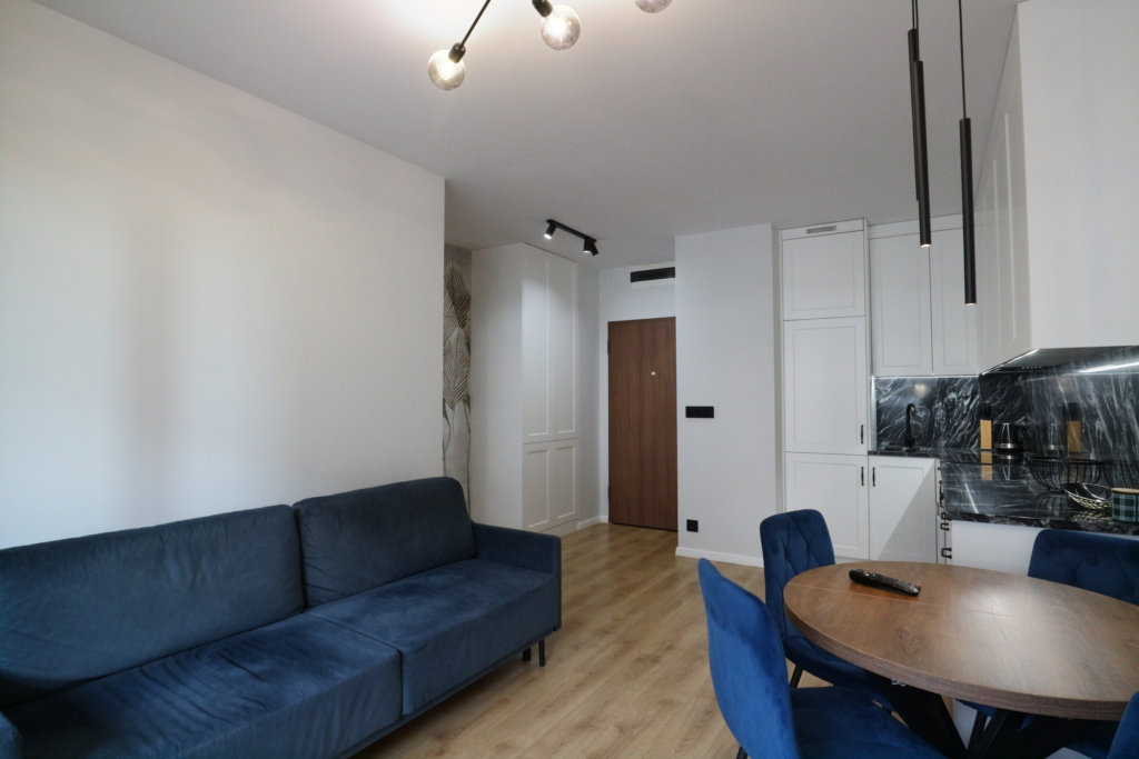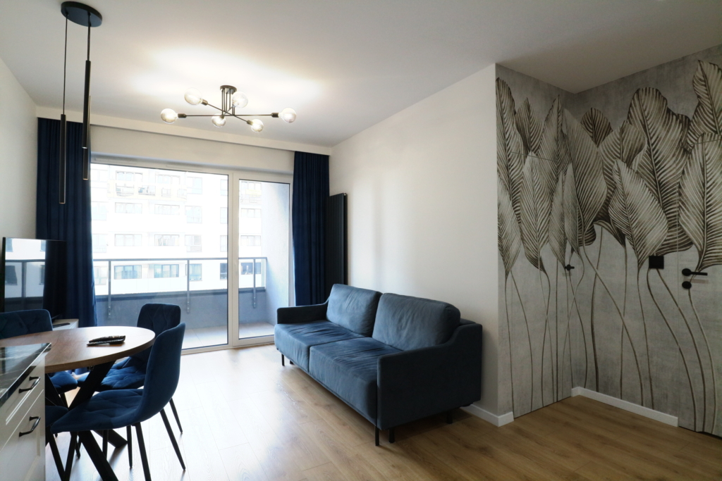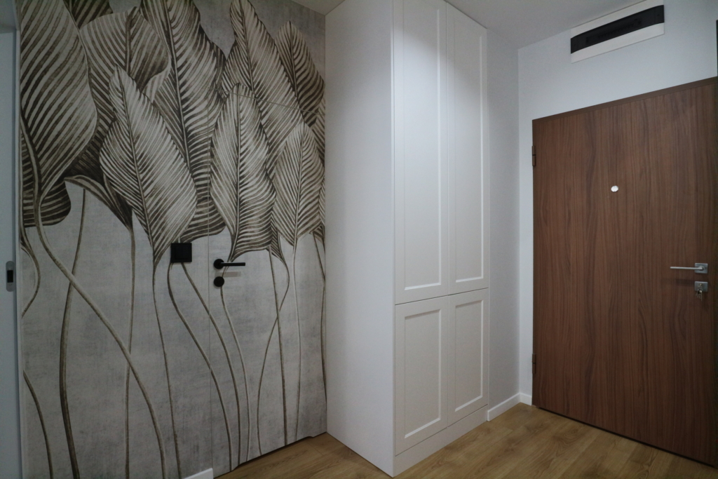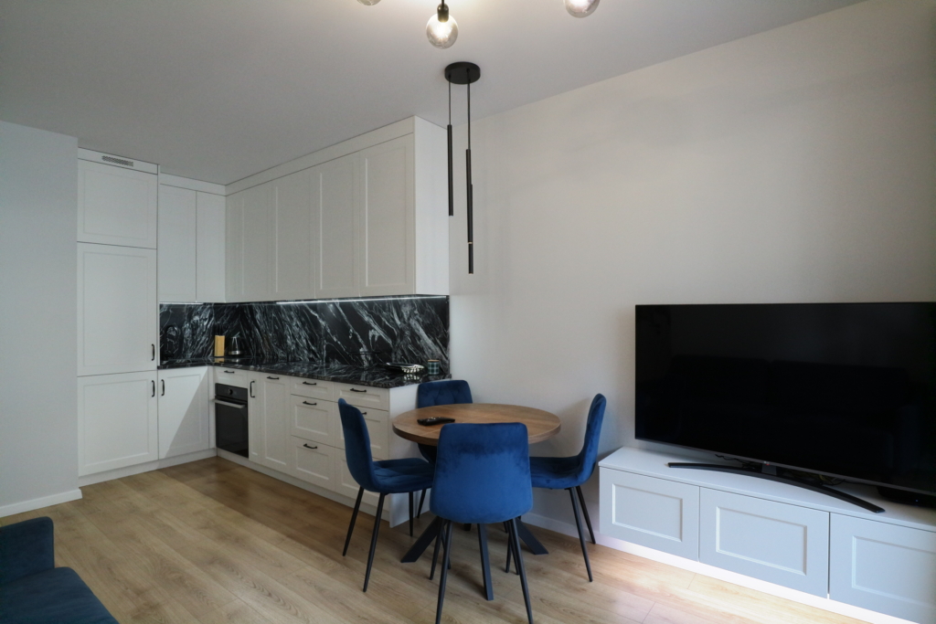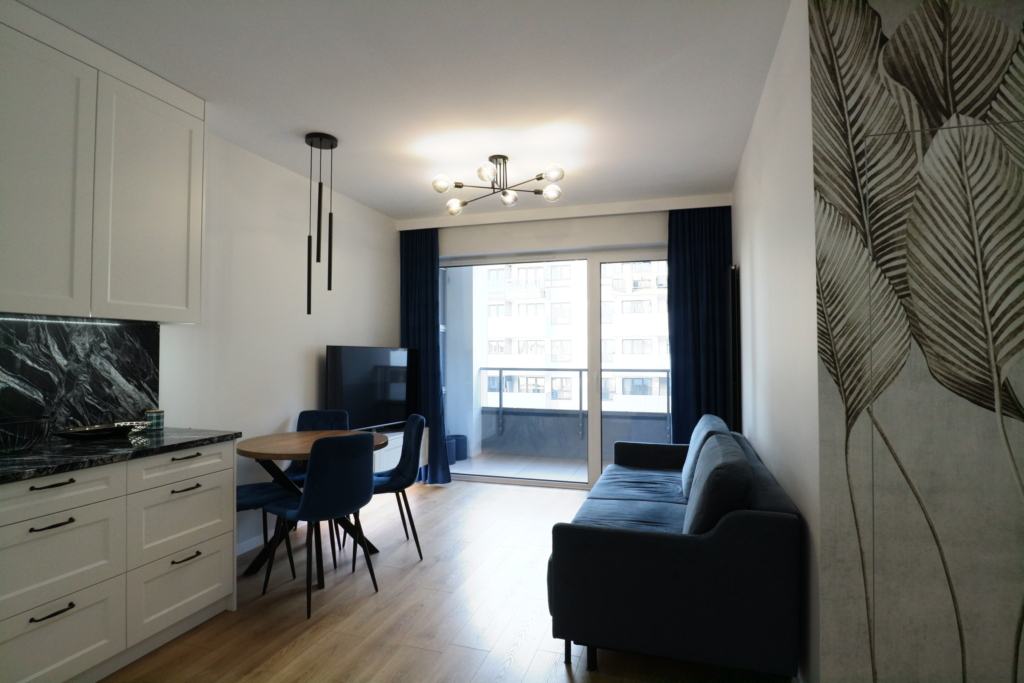 Materiał wykończeniowy: podłoga panel/gres; zabudowa stała w sypialni korytarzu i kuchni; duży blat roboczy w wersji kamień/granit; ściany tapeta ozdobna. W zabudowie kuchennej lodówka, zamrażarka, indukcja, piekarnik.