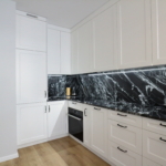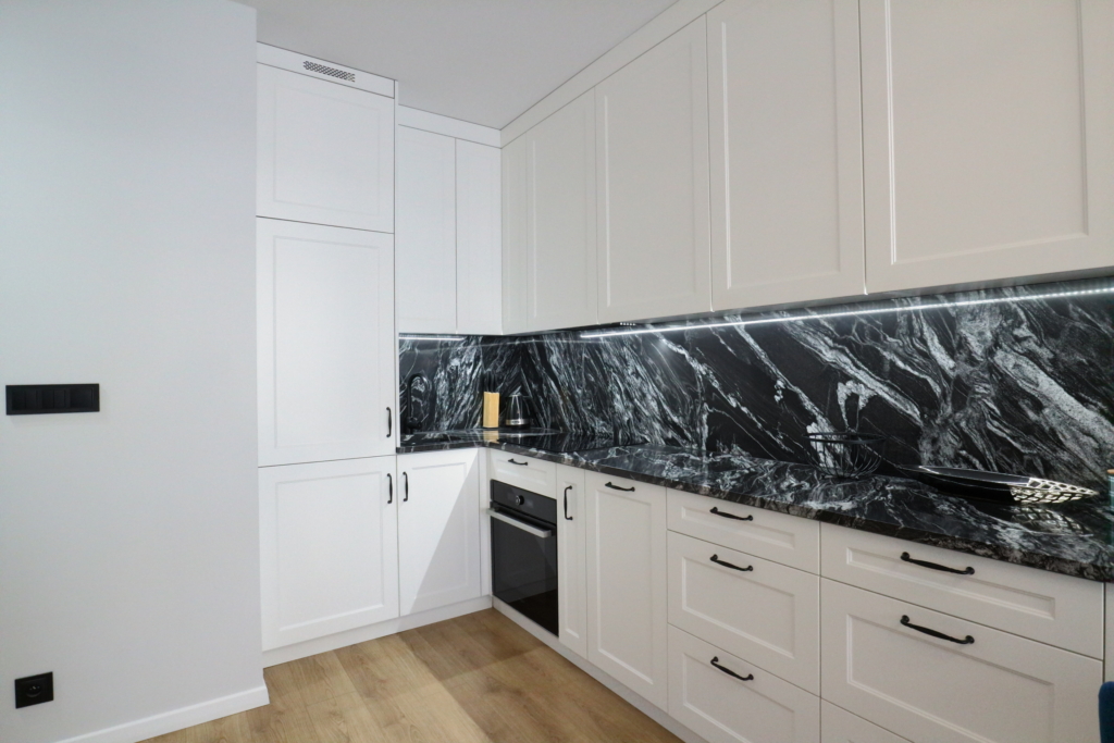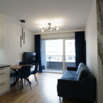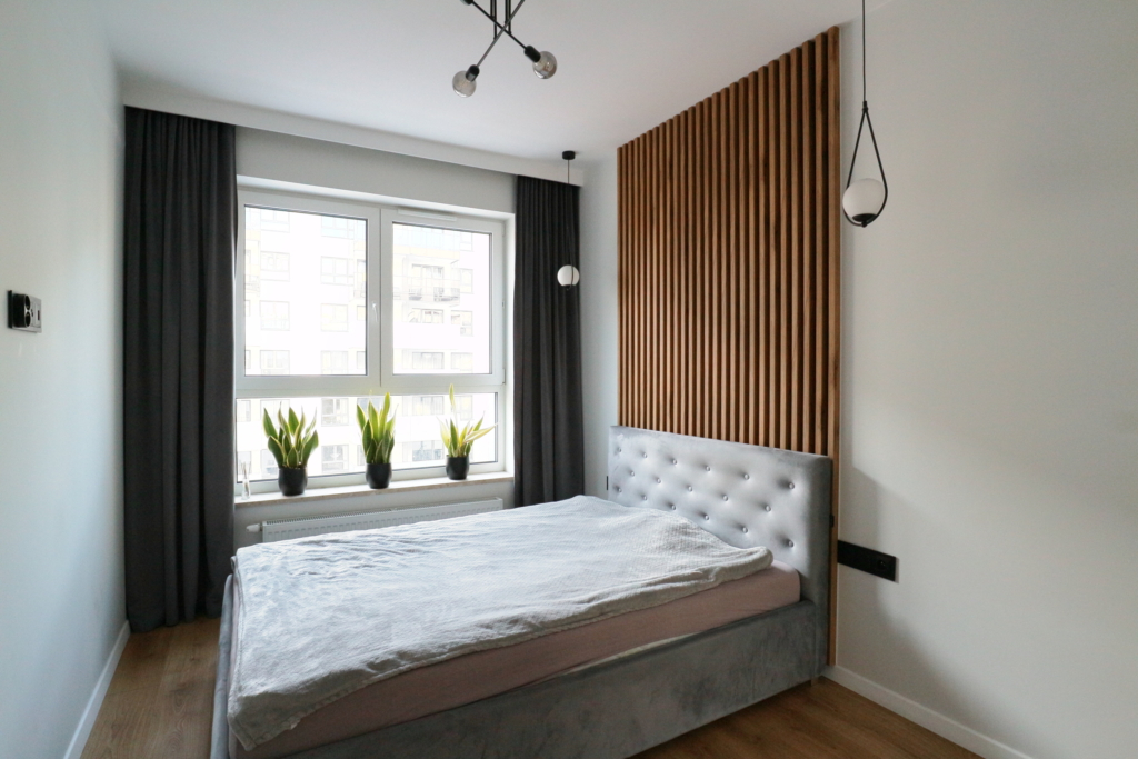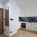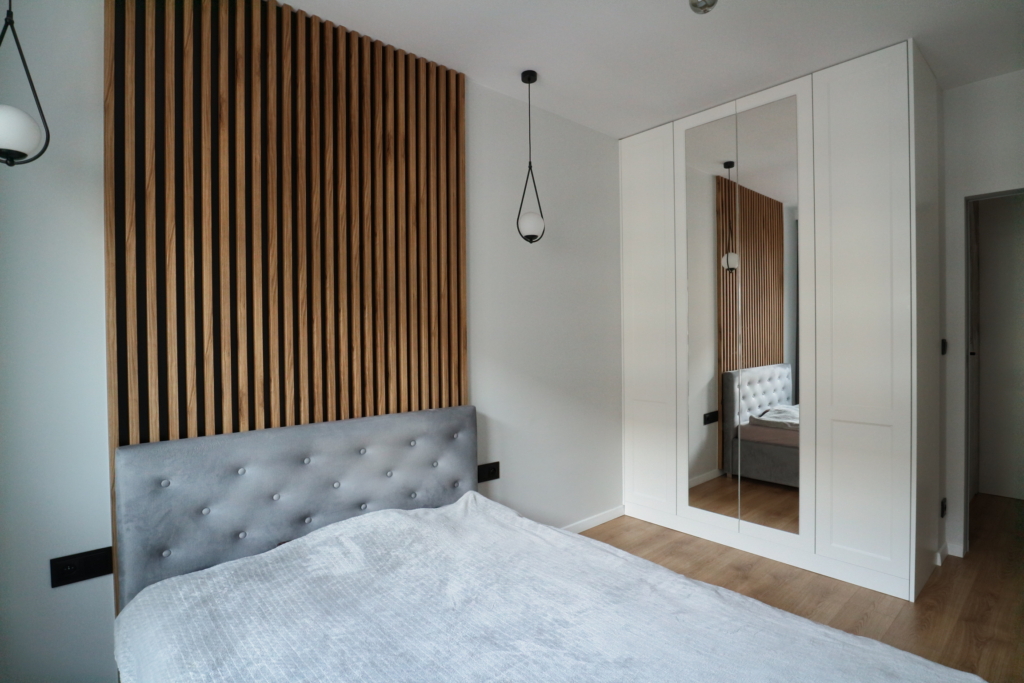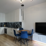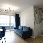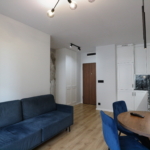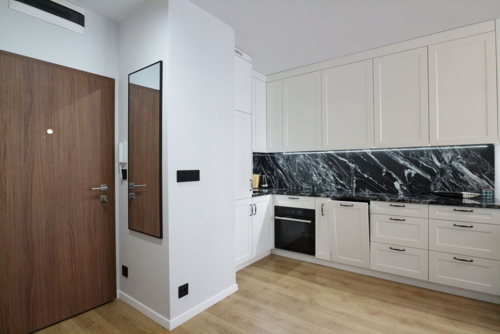 Materiał wykończeniowy: podłoga panel/gres; zabudowa stała w sypialni korytarzu i kuchni; duży blat roboczy w wersji kamień/granit; ściany tapeta ozdobna. W zabudowie kuchennej lodówka, zamrażarka, indukcja, piekarnik.