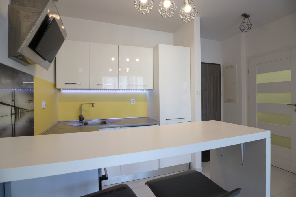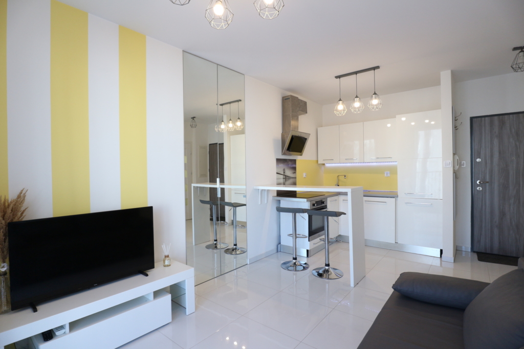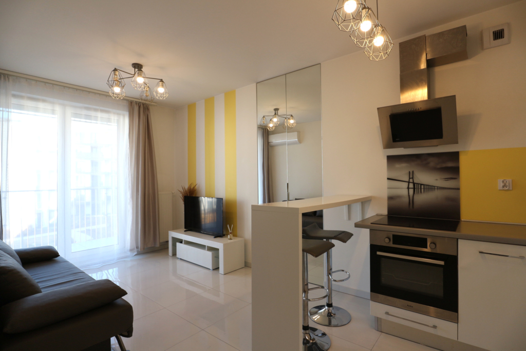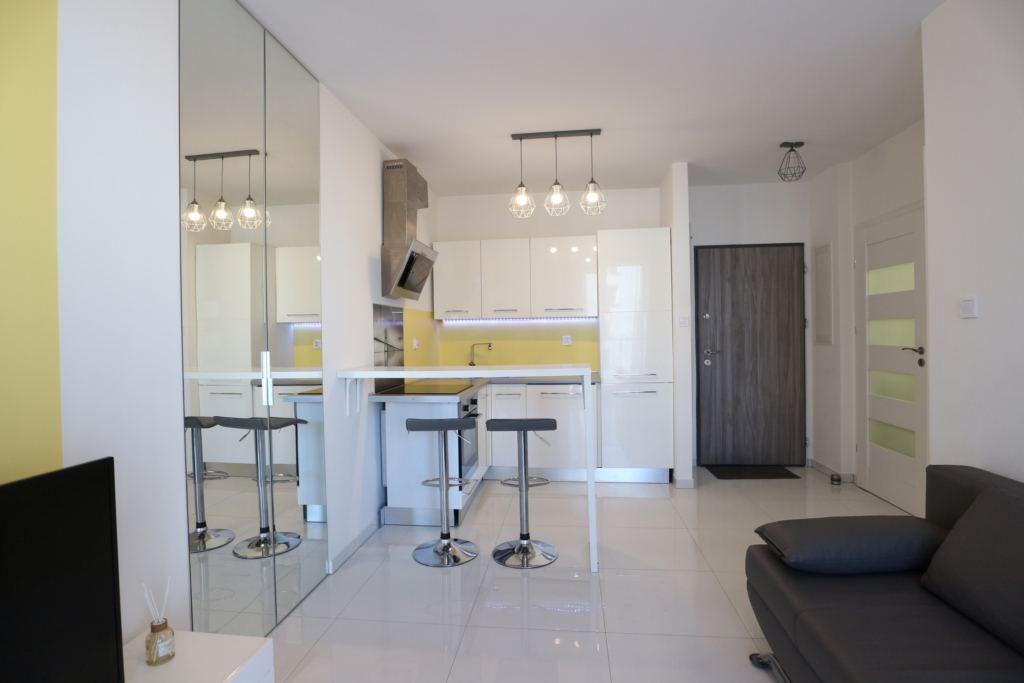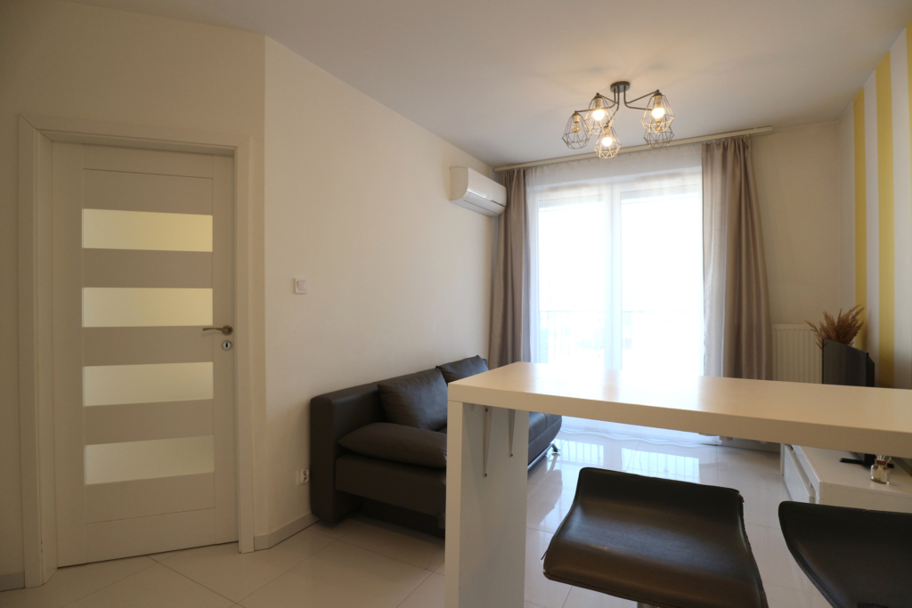 Nieruchomość sprzedawana jest z pełnym wyposażeniem (meble, zabudowy, sprzęt AGD, klimatyzacja), co czyni ją idealnym produktem pod wynajem lub dla singla/pary na start.