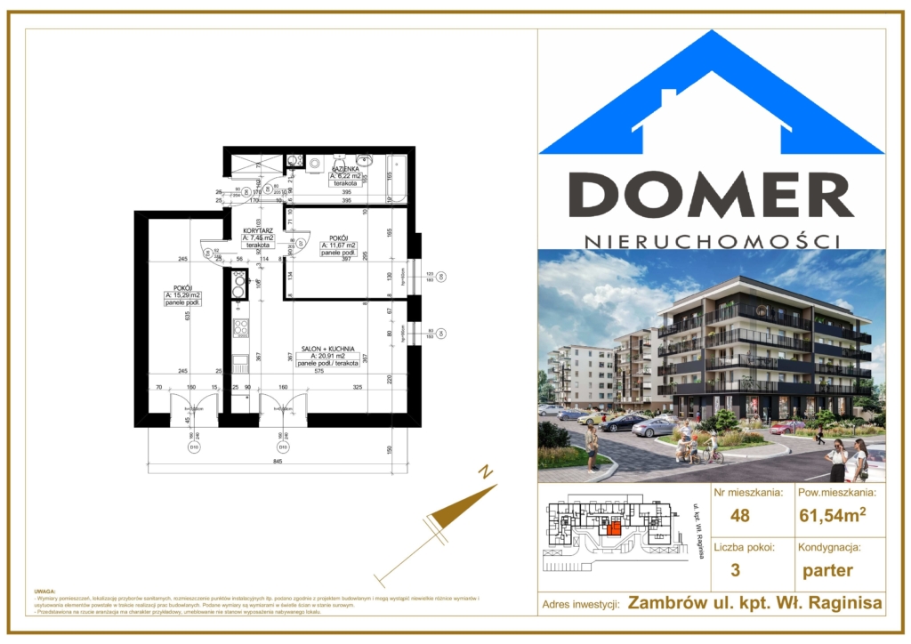 Jeżeli chcielibyście Państwo wygodnie zamieszkać w nowoczesnej i komfortowej inwestycji to proponujemy zakup mieszkania w nowym budynku mieszkalnym położonym w Zambrowie przy ul. Raginisa 9. Budynek 5-piętrowy wyposażony w windę, wentylację mechaniczną, parking podziemny. Mieszkanie 3-pokojowe zlokalizowane na parterze. Dwie sypialnie, salon z aneksem kuchennym, łazienka. Z salonu oraz jednej sypialni wyjście na taras ( do wyłącznego użytku właściciela mieszkania). Wnętrze przygotowane do wykończenia ( stan deweloperski). W trosce o bezpieczeństwo mieszkańców zainstalowano monitoring osiedlowy. Dodatkowo płatna komórka lokatorska ( 8000zł), jest również możliwość zakupu miejsca postojowego w garażu podziemnym w cenie 48.000. Biuro nieruchomości nie pobiera wynagrodzenia z tytułu obsługi tej transakcji od kupującego.