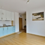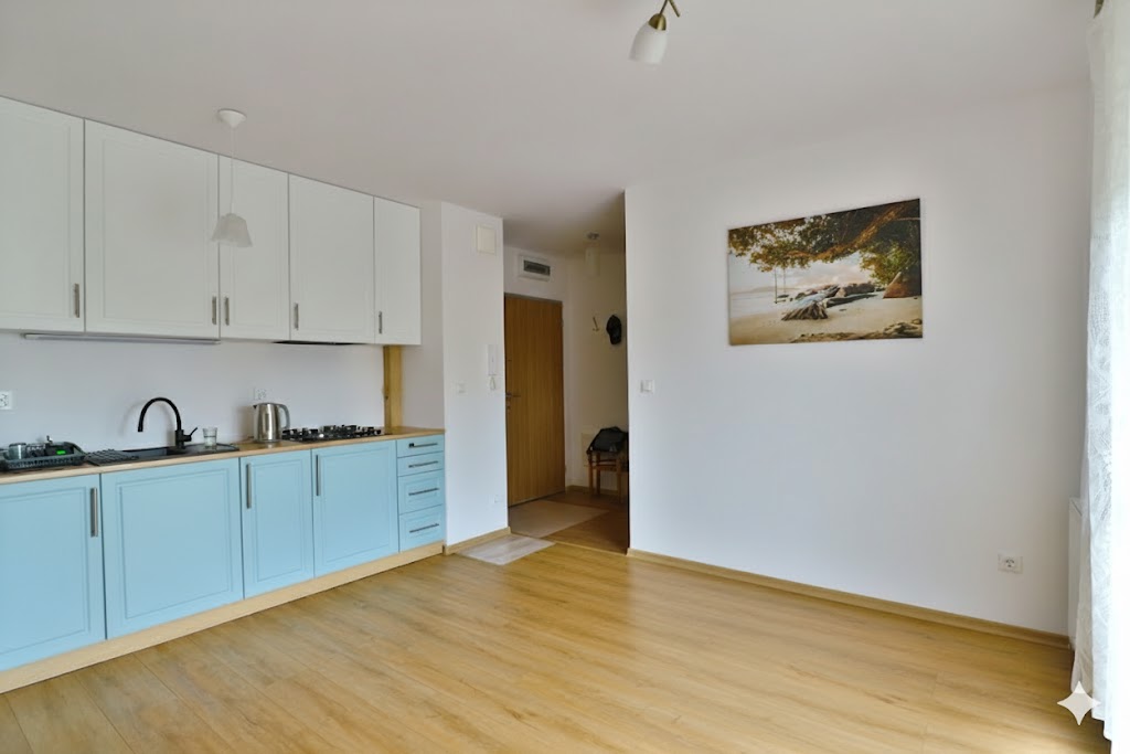 Przestrzeń mieszkalna to pokój dzienny z kuchnią w formie aneksu, pokój wypoczynkowy, korytarz i łazienka z wc.